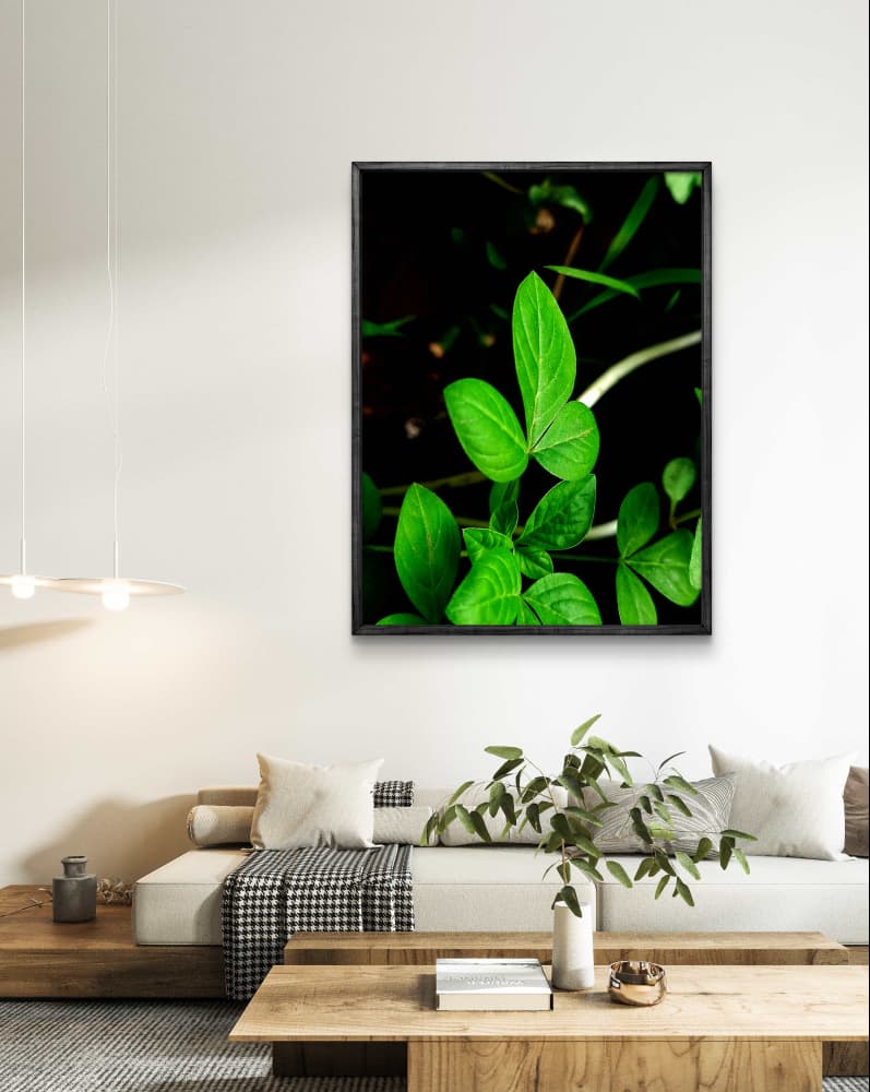 This stunning close-up photograph showcases vibrant green leaves against a dark backdrop, emphasizing the intricate textures and natural beauty of plant life. Perfect for home decor, this image brings the calming presence of nature indoors, ideal for creating a refreshing and serene atmosphere in any living space. Whether you’re decorating your living room, office, or personal sanctuary, this art piece adds a touch of natural elegance and tranquility. Perfect for nature enthusiasts and those looking to infuse their home with a sense of peace and vitality.