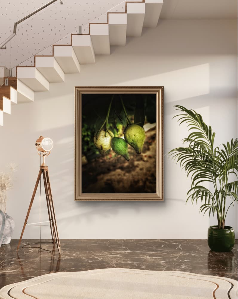 A captivating close-up of green pears suspended in the natural light, capturing their organic beauty and texture as they dangle from the tree. The photograph radiates tranquility and a connection to nature, framed by soft shadows and warm hues that highlight the pears’ delicate skin. The earthy tones of the setting complement the vibrant fruits, creating a peaceful and inviting atmosphere in the room.