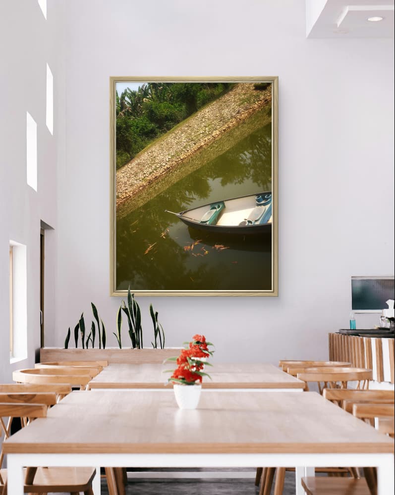 This captivating image captures a peaceful moment by the water’s edge. A small boat floats serenely in the canal, its reflection mingling with the calm waters. Framed in a minimalist interior, the scene exudes calm and tranquility, perfect for evoking a sense of relaxation and escape.